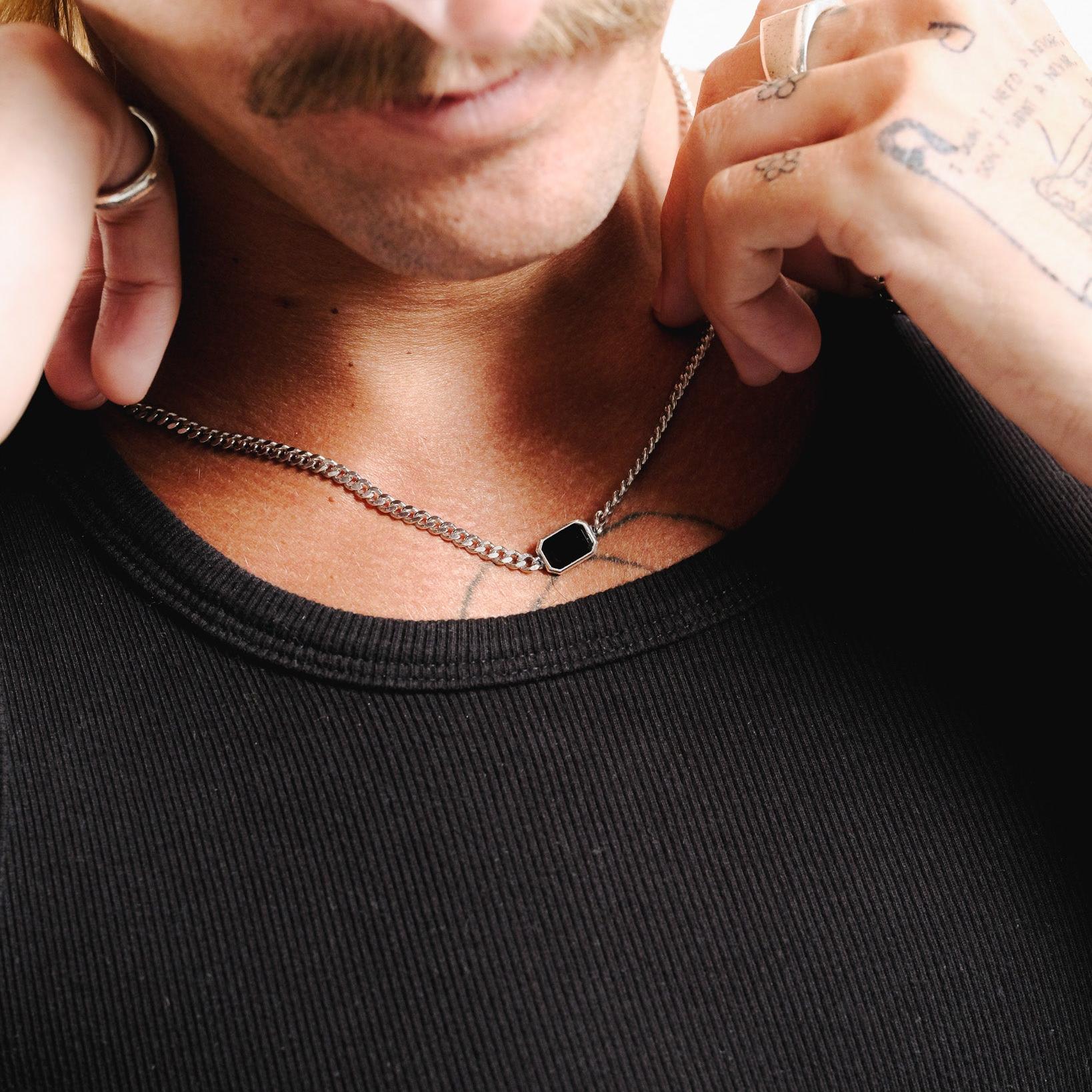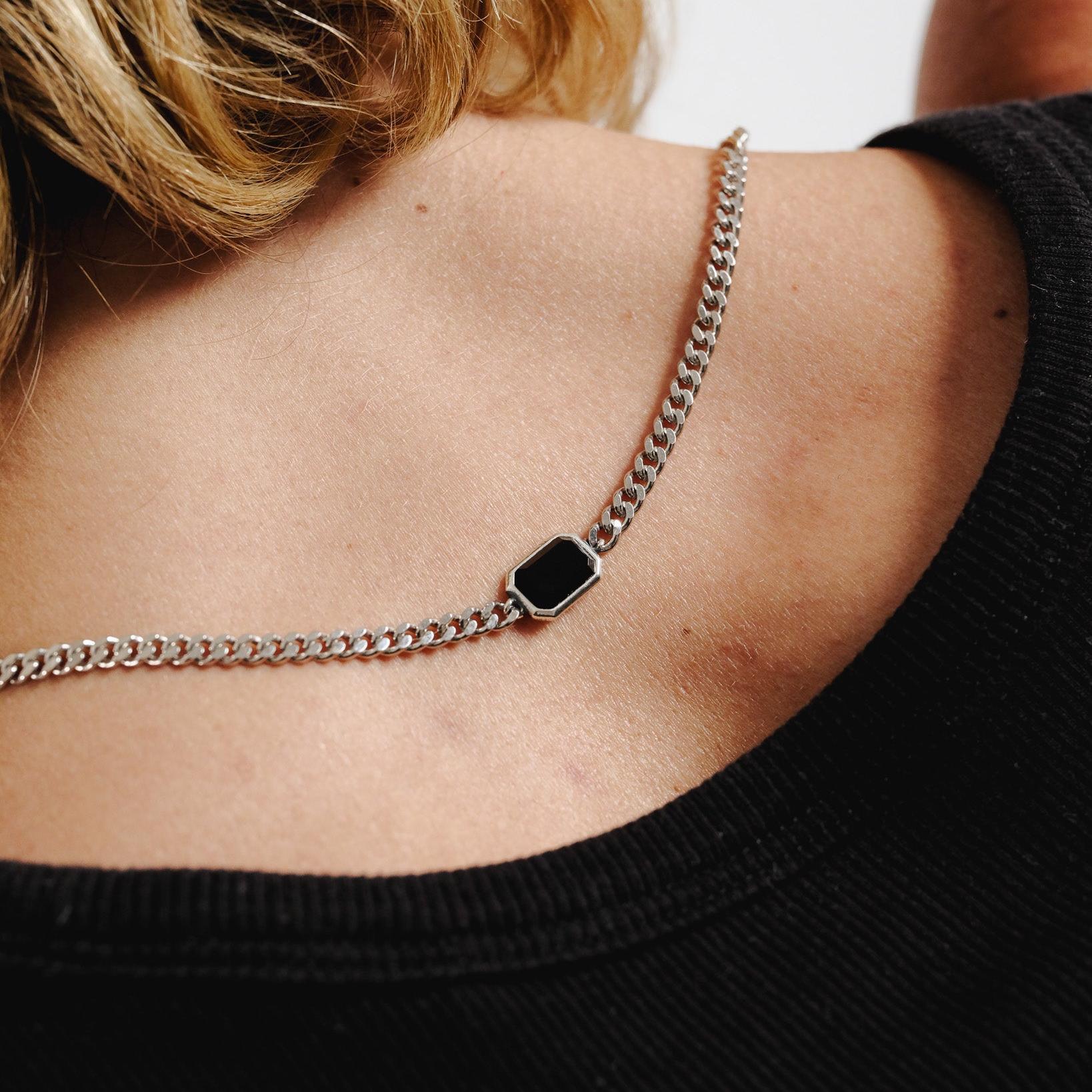 The Eclipse Necklace is a black onyx necklace set into a sterling silver chain, fixed, not hanging. It doesn’t move. It holds.