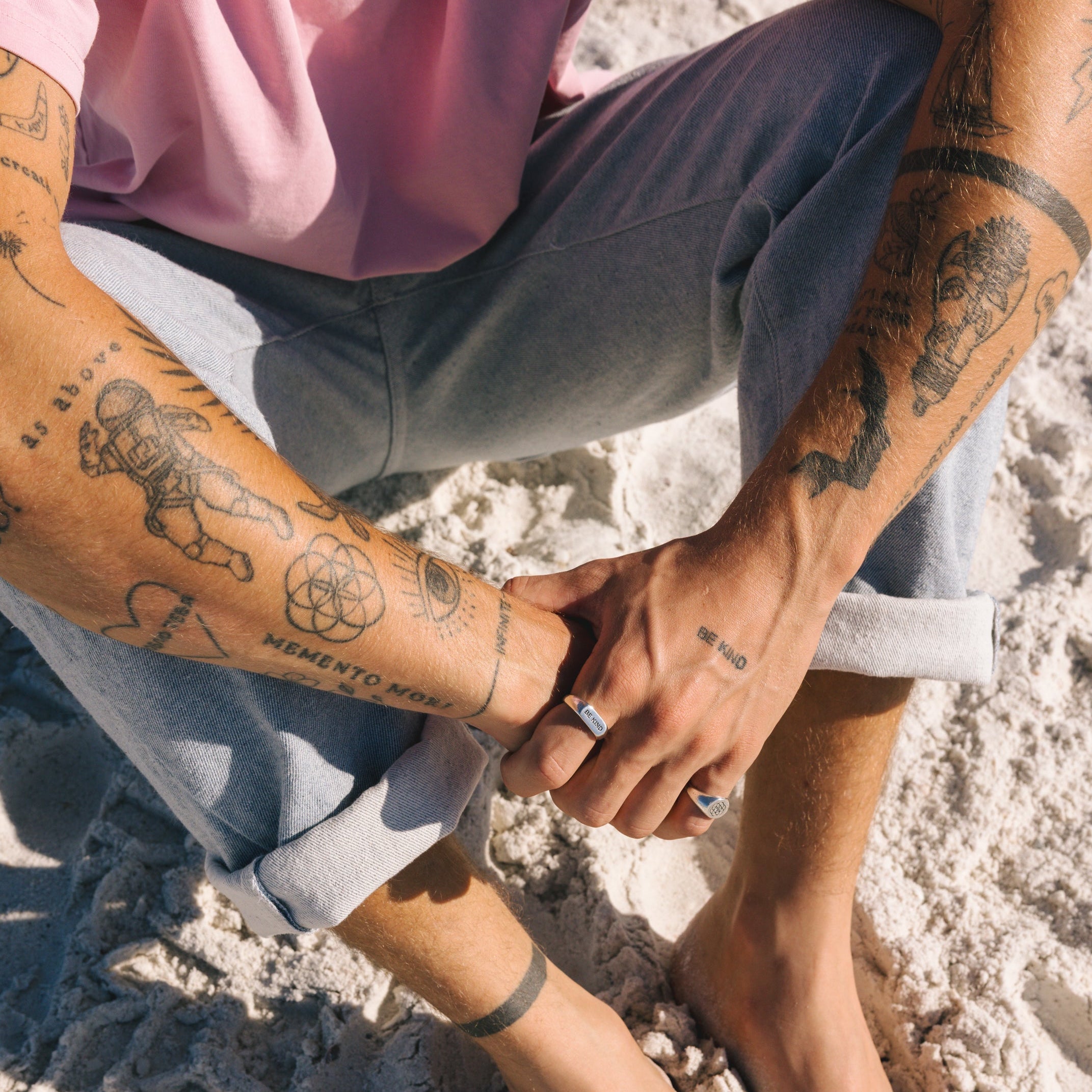 The Be Kind ring stems directly from my own hand tattoo, which simply reads “Be Kind.” For me, it’s a gentle but constant reminder to lead with kindness, especially in moments where it’s easier to react with anger, judgment, or ego.